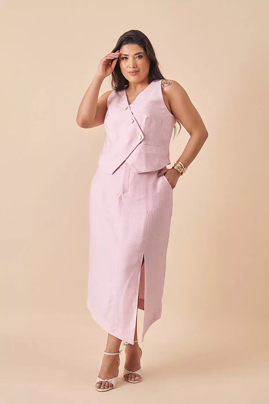 Saia midi forrada, bolsos frontal funcionais, fenda lateral, fechamento por botão frontal e elástico na cintura nas costas.