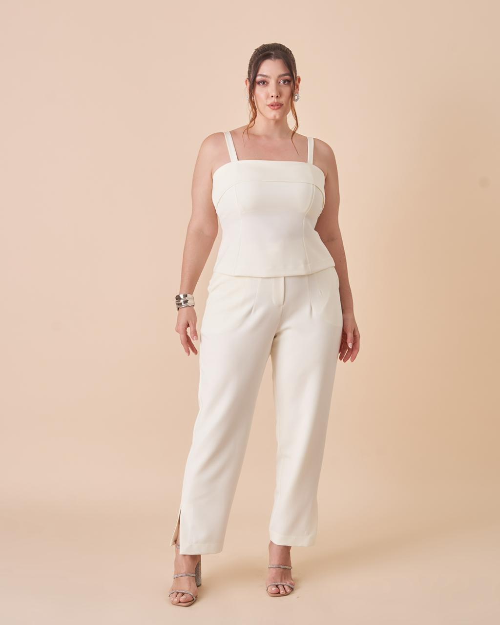 Calça cenoura forrado, bolsos frontal funcionais, fenda lateral na barra e elástico nas costas para maior conforto.