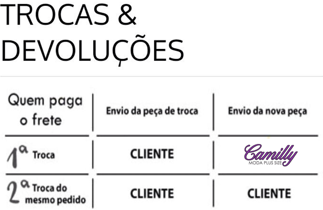 2.6) Para o caso de arrependimento, a Camilly Moda Plus Size realiza o reembolso somente do valor pago pela peça. No caso de defeito, a Camilly Moda Plus Size reembolsa os valores pagos pela peça e pelo frete.