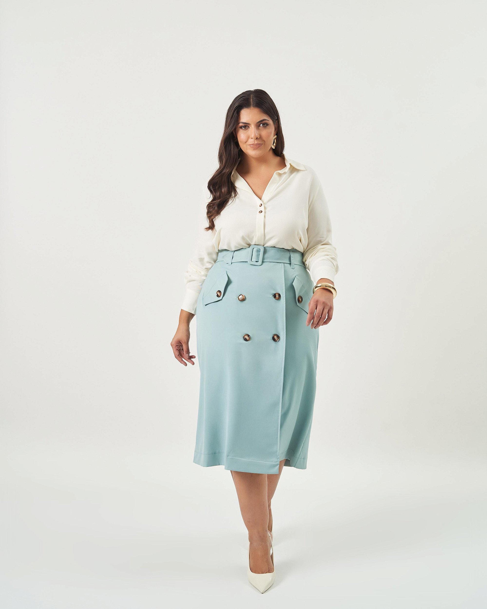 Saia em sarja, comprimento midi, cintura alta, toque leve mas estruturado, detalhe de abotoamento frontal duplo por botões marmorizados em resina, passantes que acompanham cinto faixa embutido e cós traseiro com elástico embutido.