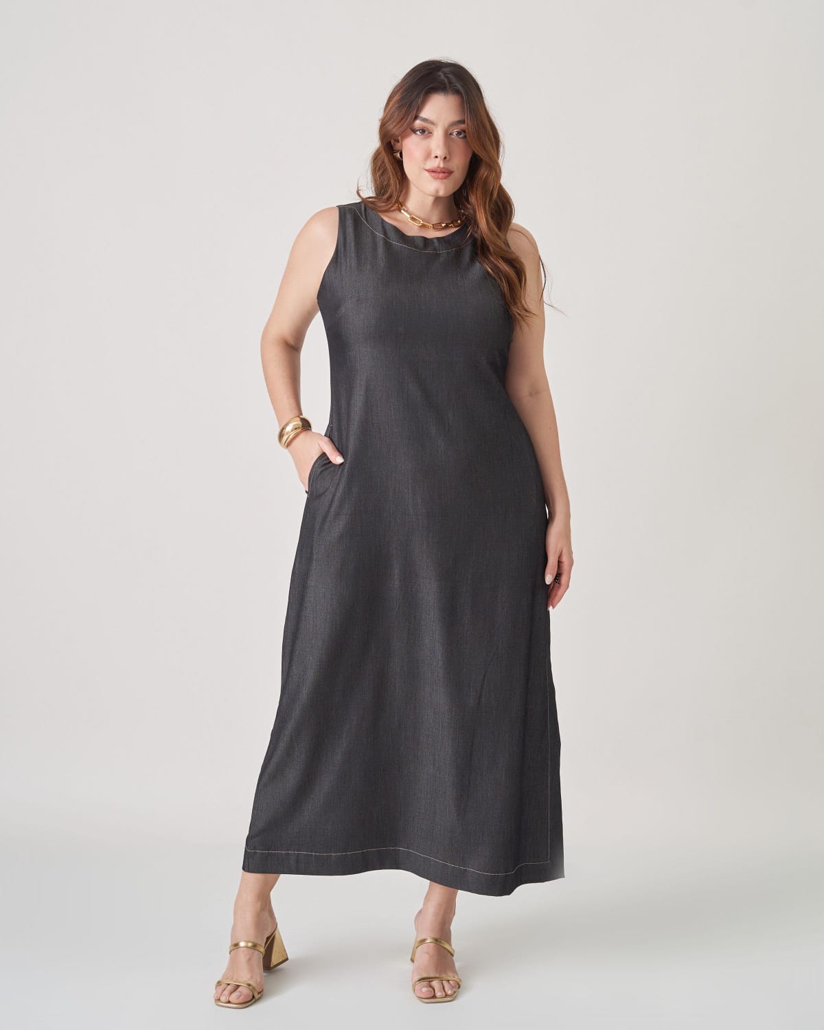 Vestido midi sem mangas, Silhueta levemente evasê com decote redondo e bolsos funcionais, fechamento posterior por zíper destacável metálico, conferindo personalidade à peça, costuras marcadas com pesponto aparente e recortes estratégicos.